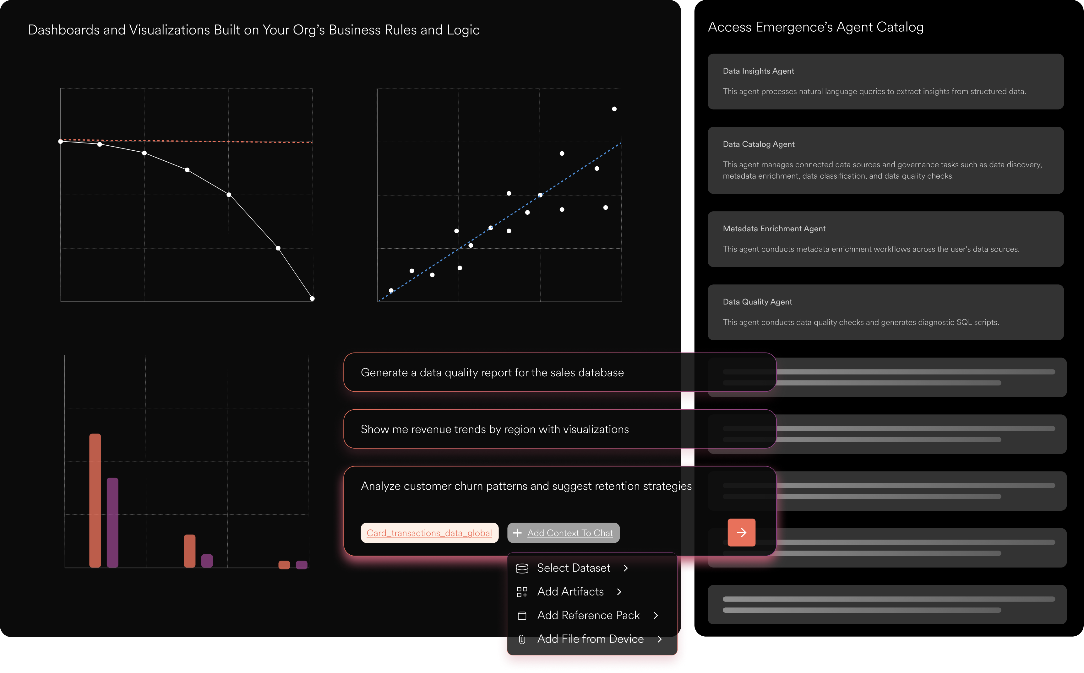 Our platform is built with integration and interoperability in mind; customers bring their own tools, data, and AI (models and agents). Our platform currently includes the Agent Registry (which catalogues Emergence, enterprise-specific, and third-party agents), services and data registries that connect these agents with tools/apps/data, and an Agent Software Development Kit to introduce non-Emergence agents in the platform. We also offer flexible deployment options for optimal scalability, security, and compatibility with existing systems.