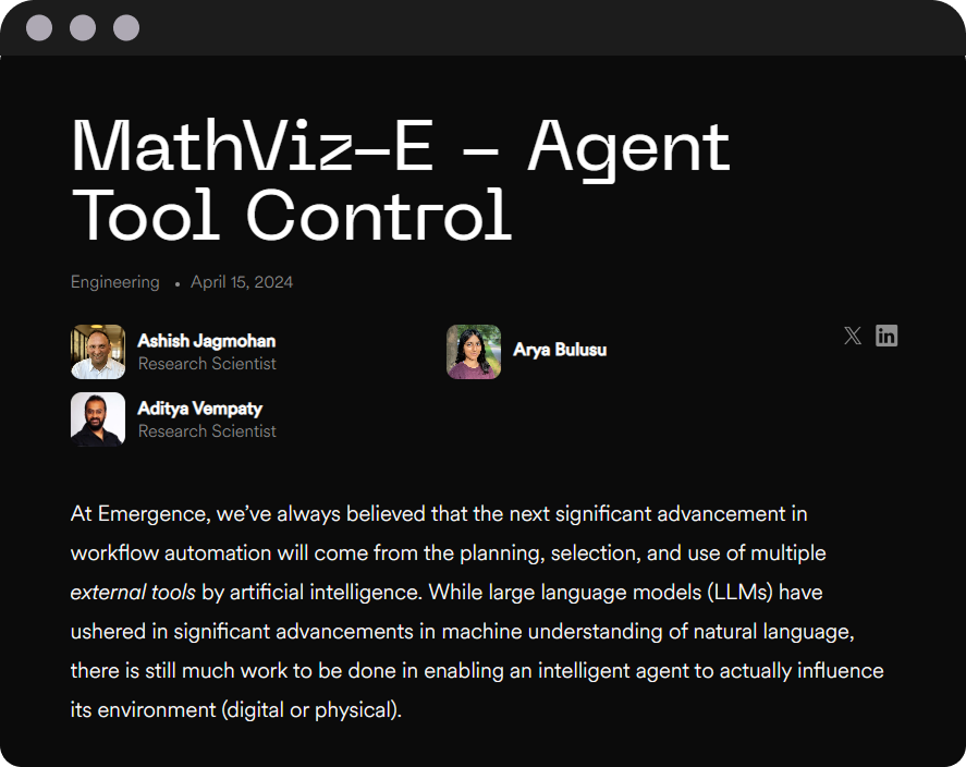 Emergence made a significant advancement in workflow automation through an agent that controls tools such as math solvers and graphing calculators to create complex mathematical visualizations based on natural language instructions.
