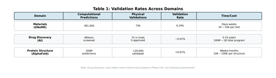 2. The bottleneck is validation capacity and prioritization. With 381,000 predictions and budget for 736 validations (GNoME example), success requires strategic allocation based on what matters scientifically and economically. This is human judgment, not computational optimization.