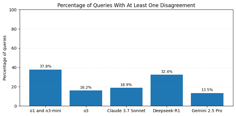We can understand this metric as the chance that the model will produce inconsistent answers if you ask the same question three times. On our tests, Gemini 2.5 Pro and o3 produced the most consistent answers; o1/o3-mini and Deepseek-R1 were the least consistent. Due to the fact that OpenAI thinking models and Claude 3.7 Sonnet don’t allow for specifying temperature, we compare all the models with their default temperature settings. However, if more consistency is needed when using Gemini or Deepseek, the temperature could be set to a lower value to encourage more consistent answers.