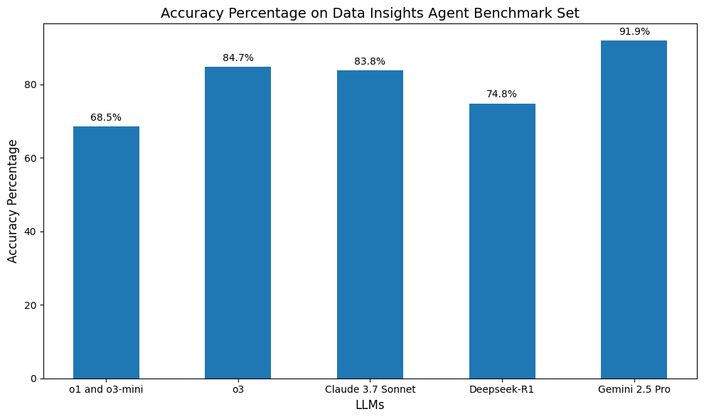 In today's data-driven landscape, the ability for enterprises to rapidly and accurately extract insights from their data is paramount for maintaining a competitive edge. To address this, Emergence built the Data Insights Agent, which allows users to easily analyze their data through natural language queries. The Data Insights Agent (DIA) takes in datasets and analysis requests, intelligently plans the analysis, writes and executes the necessary code, and summarizes the key findings. The engine behind all of this is the Large Language Model (LLM) that handles planning and code generation. This post explores our recent findings on how selecting different LLMs significantly affects the performance and quality of results produced by the DIA. We evaluate thinking models from OpenAI, Anthropic, Deepseek, and Google.