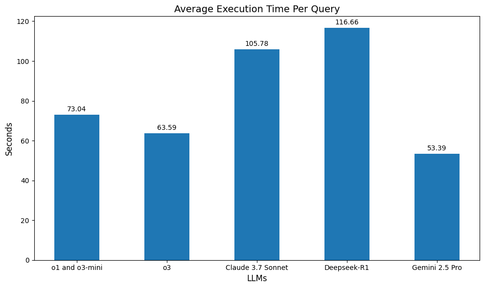 We measured the execution time for each query, which includes up to three retries if the model generates syntactically incorrect code. Claude 3.7 Sonnet and Gemini 2.5 Pro were called through Vertex AI, OpenAI models through the OpenAI API, and Deepseek-R1 through AWS Bedrock.