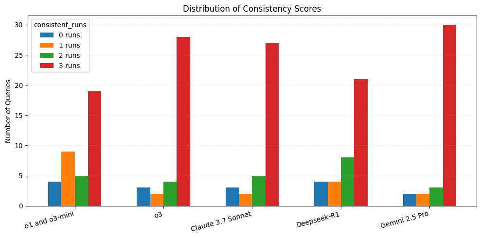 For each query we ran through a model, we produce a consistency score that measures the number of runs that agree with the ground truth. Using this as a proxy for consistency, we can interpret it like this: