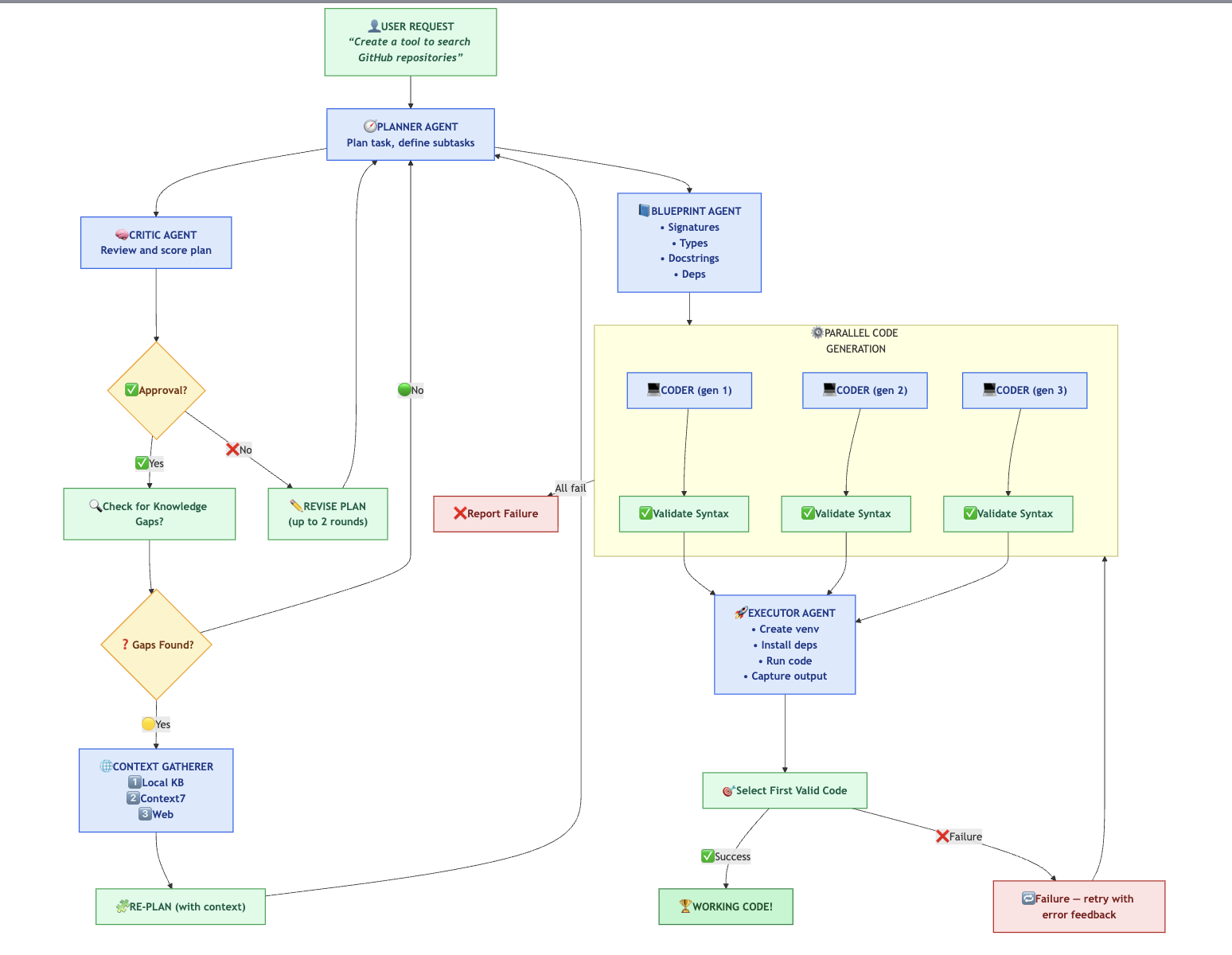 This worked but was wasteful. Simple requests like "Create a function to add two numbers" went through the full workflow: planning, critique, context gathering, blueprint, three parallel generations, execution. Overkill.