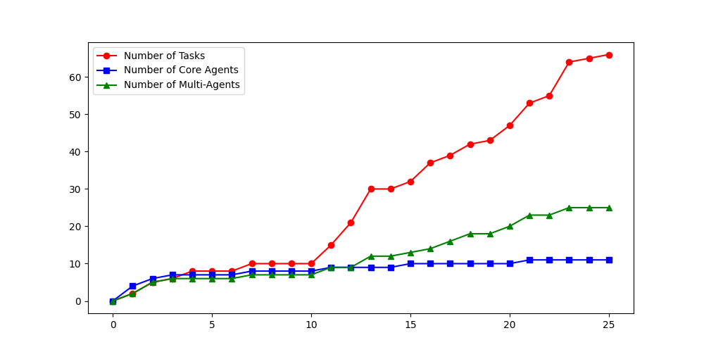 Figure 2(a) shows the growth of tasks, agents and multi-agent systems with self-exploration across iterations. As new tasks get generated, the previously created agents get reused and their capabilities are expanded as required, or new agents are generated. While many tasks are generated in each iteration, the percentage of tasks that succeed in the initial iterations is lower since the system is still figuring out the context. Figure 2(b) shows that the accuracy of generating valid tasks improves with iterations. Figure 2(c) shows that the average sophistication of tasks increases with iterations, as is evident from relatively longer plans.