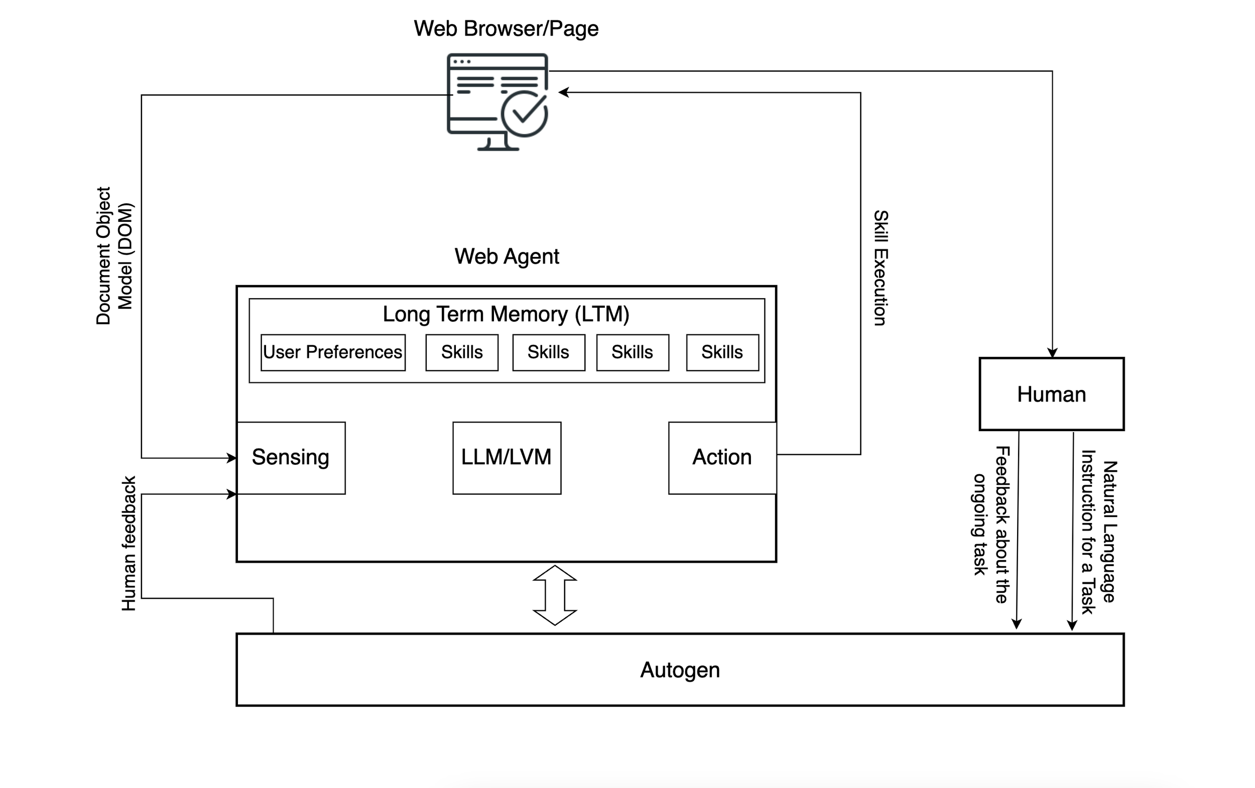 Our web agent architecture is highly scalable and extensible. More skills can be added very easily by registering new skills using the Autogen framework [2]. It then creates a JSON representation of the skills to make use of LLMs that support function calling. The verbose representation of skills, while advantageous, can consume a significant number of tokens. We are considering using a lightweight router that can provide a compact representation of the available skills to the LLM while exposing itself as a skill so that it maintains the skill registration and extension paradigm.
