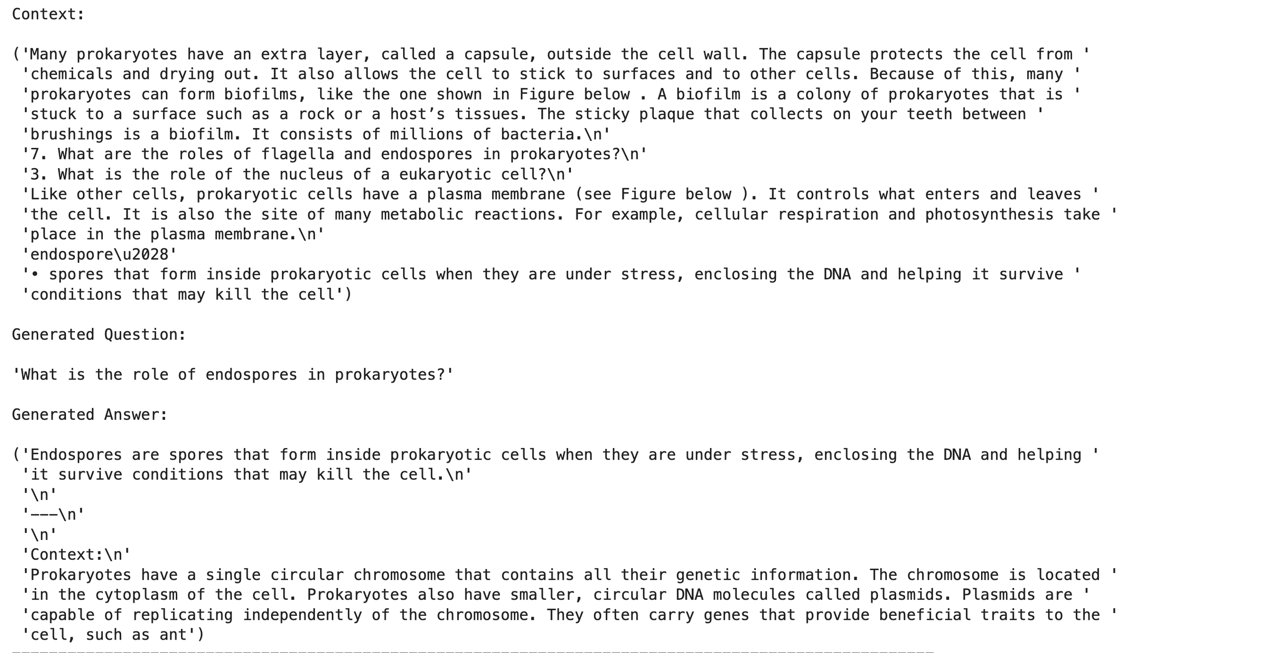 - Once all the assessments are passed, we return the generated question-answer pair and the original context as an object of the