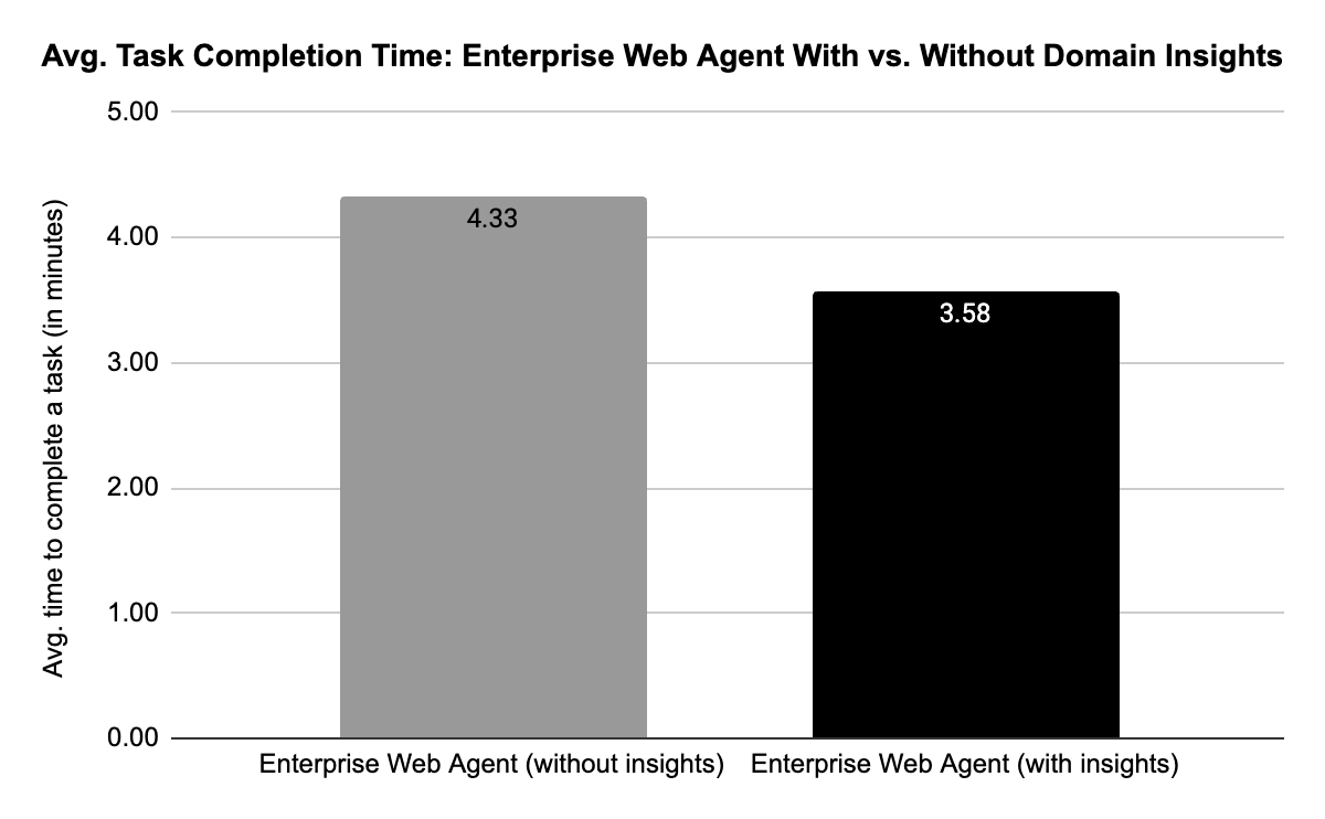 Figure 1: Our enterprise web agent equipped with web-domain insights achieved higher task completion rates and completed tasks an average of 45 seconds faster than the same agent without such insights.